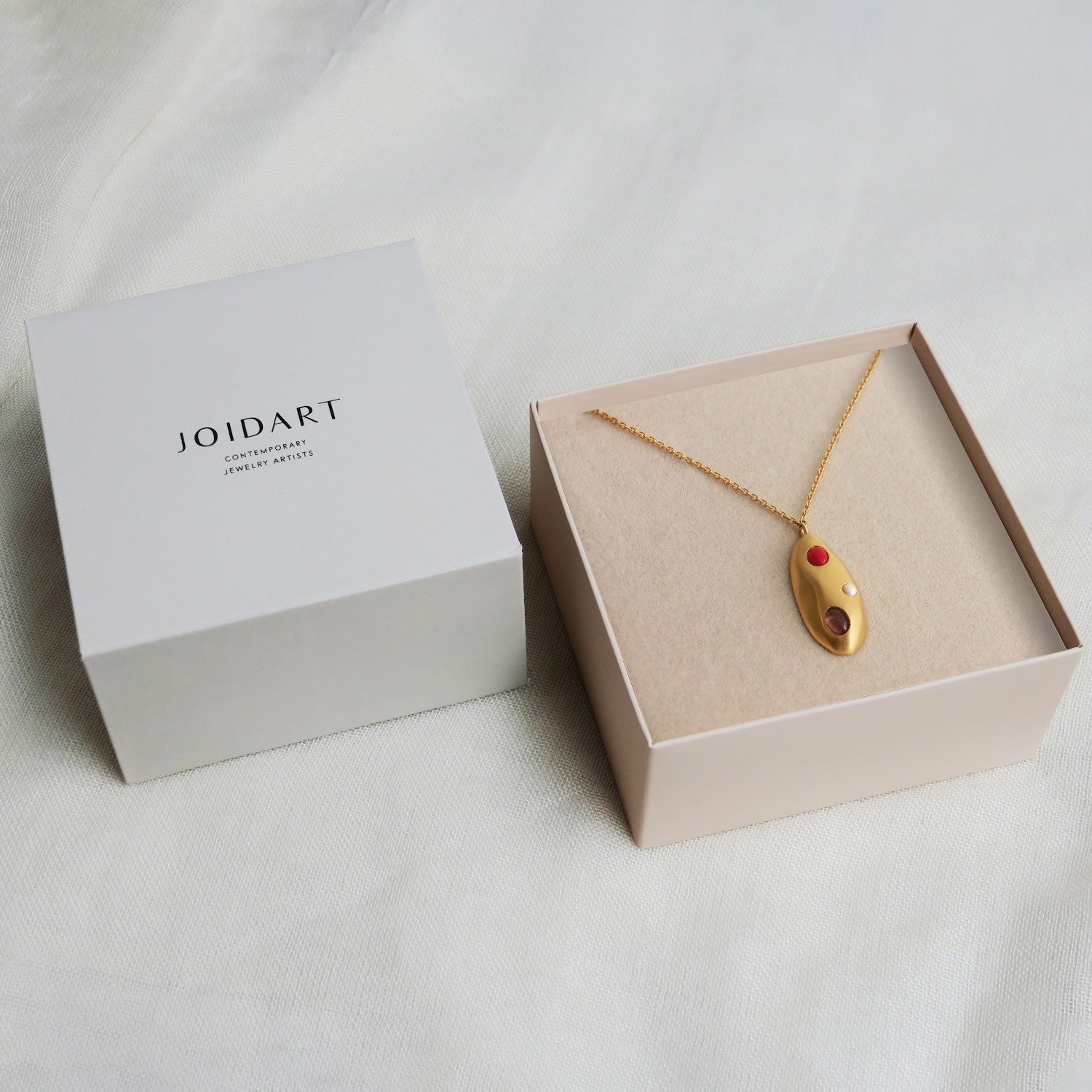 Golden necklace with a rounded pendant inlaid with Murano glass, in mauve tones, and white crystal pearls. In 24 K gold-plated matte metal. Chain with lobster closing and extension chain.