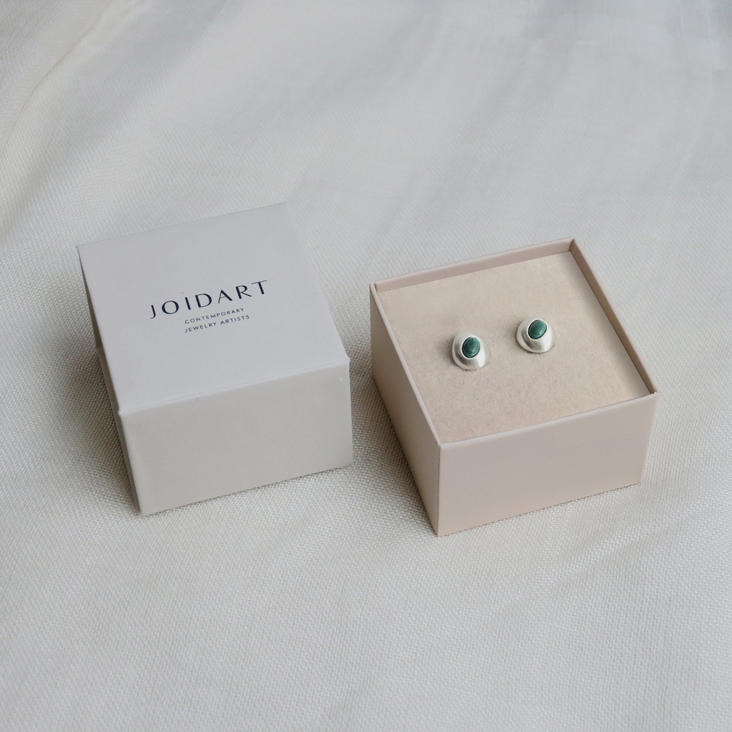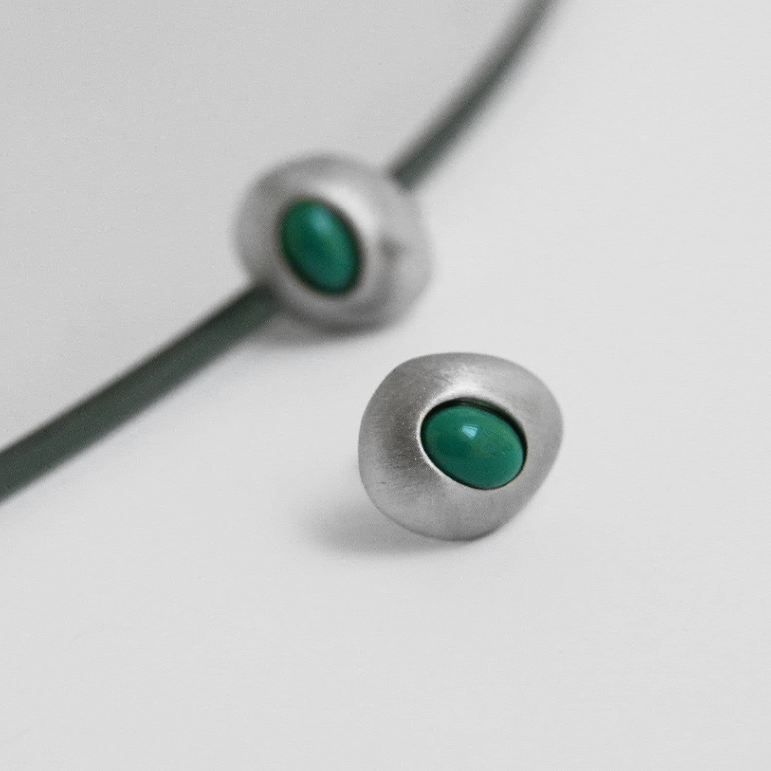 Small rounded earrings with Murano glass, in a green tone. In platinum-plated sterling silver. Butterfly nut closure.