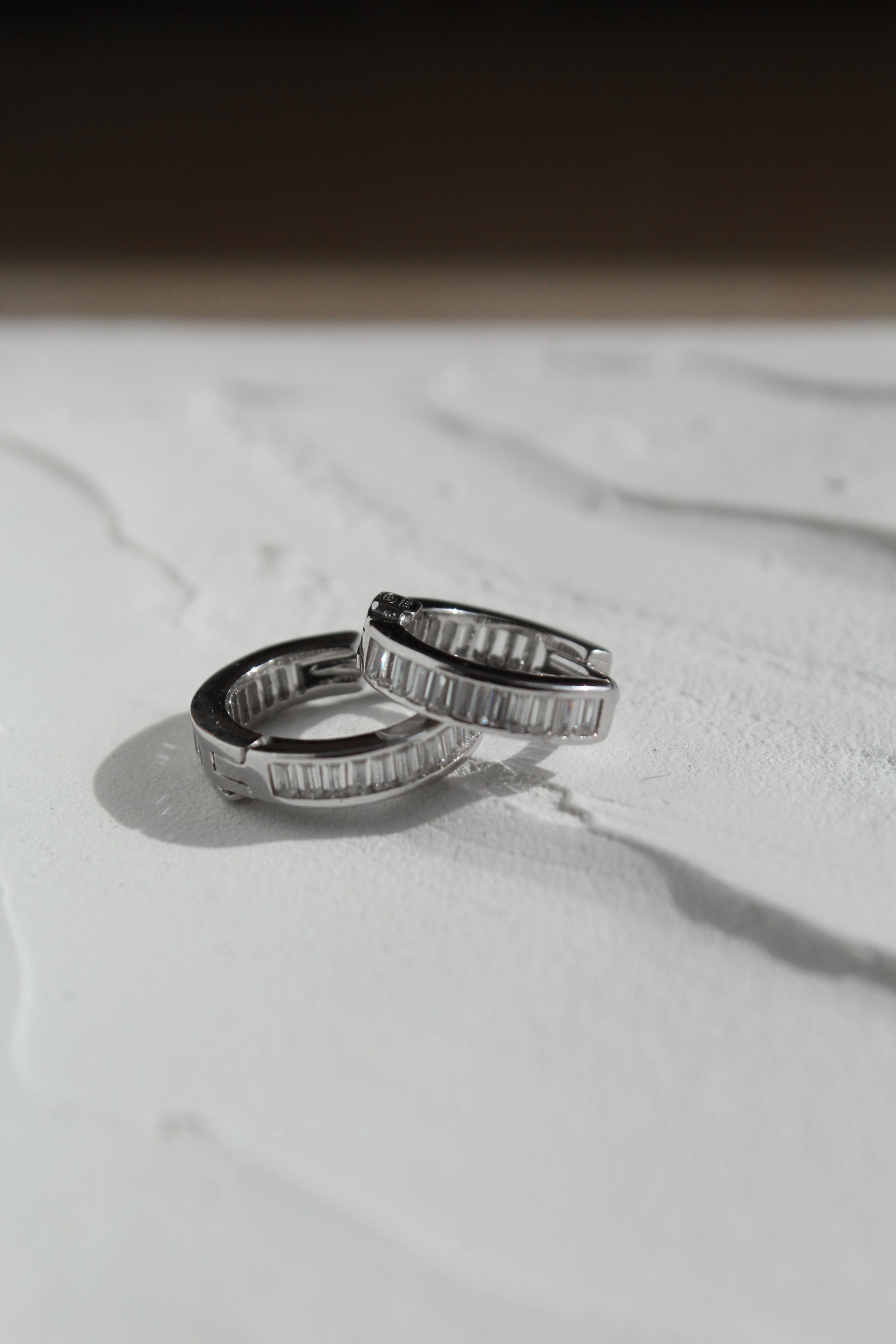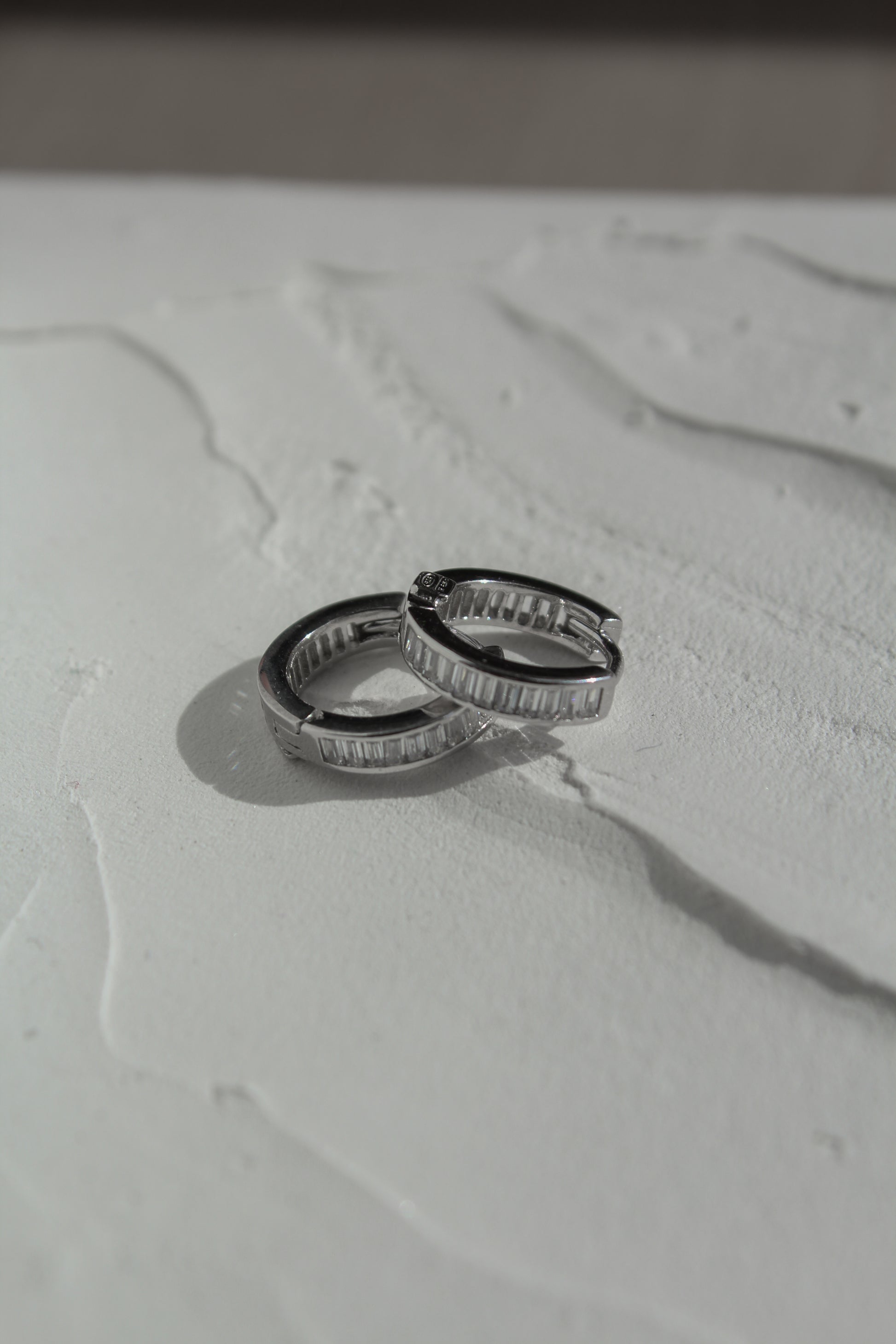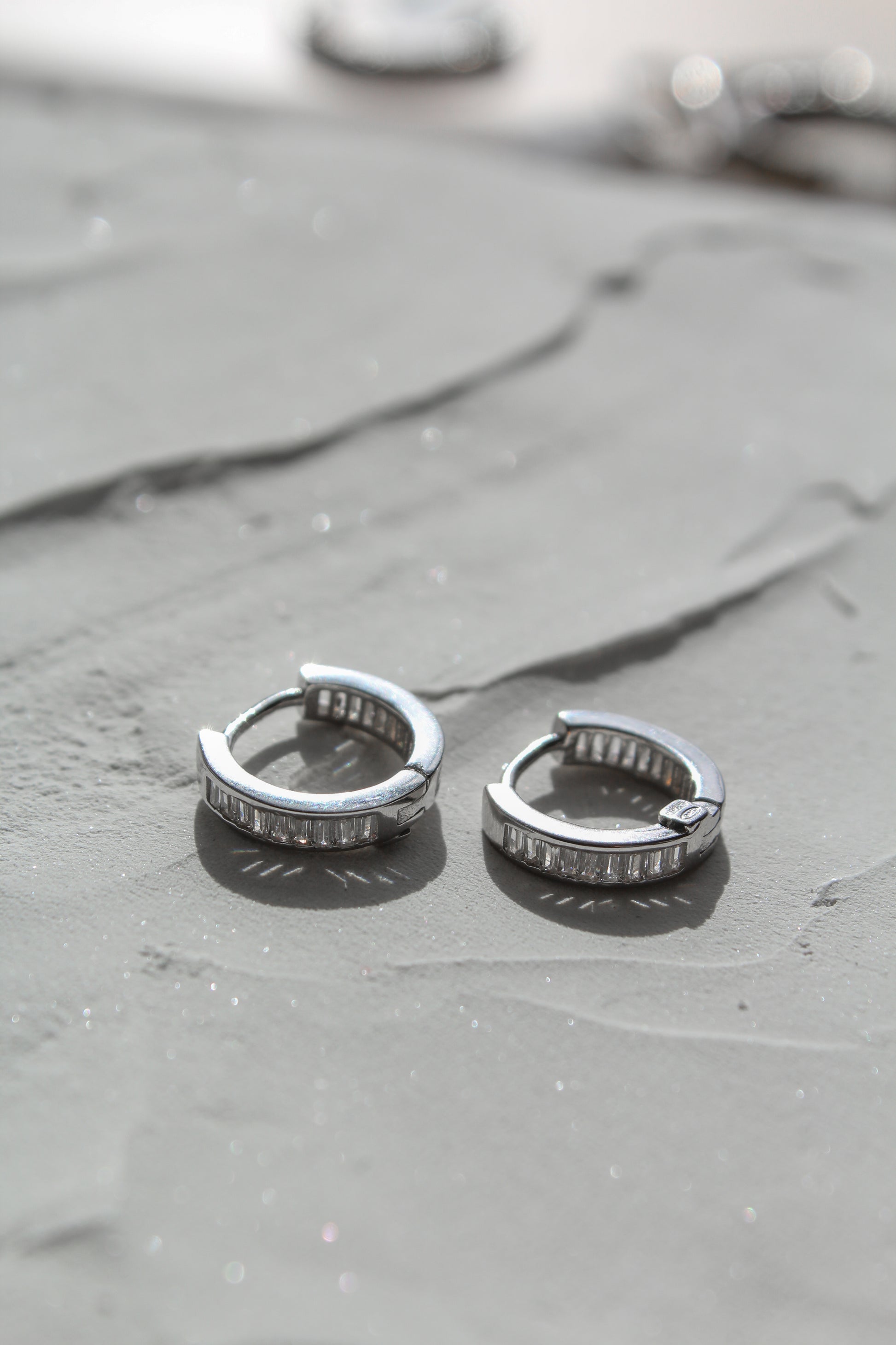 Get ready to elevate your earring game with our Baguette Hoops! Featuring stunning baguette cut cubic zirconia, these huggie style hoops will add a touch of sparkle to any day. Don't miss out on this perfect combination of subtle and statement.