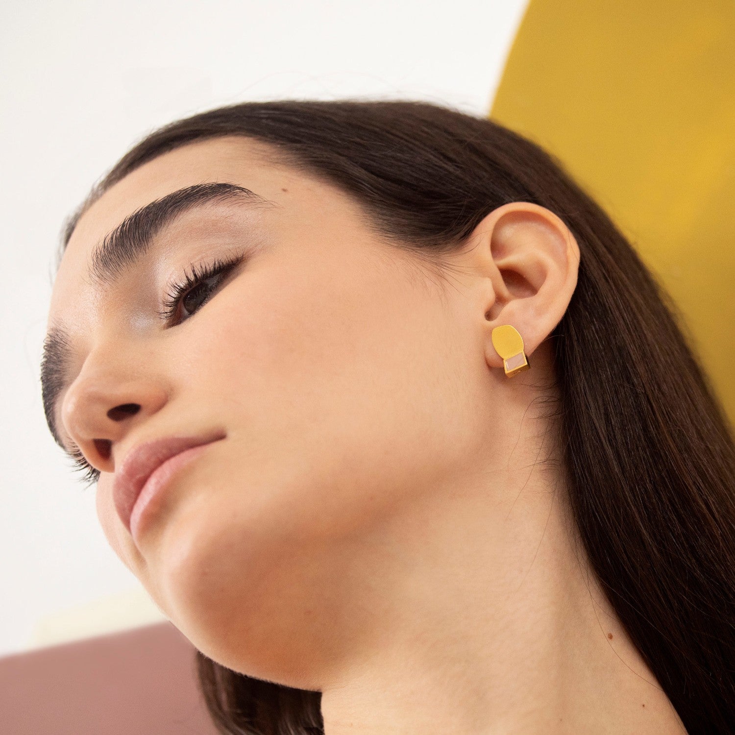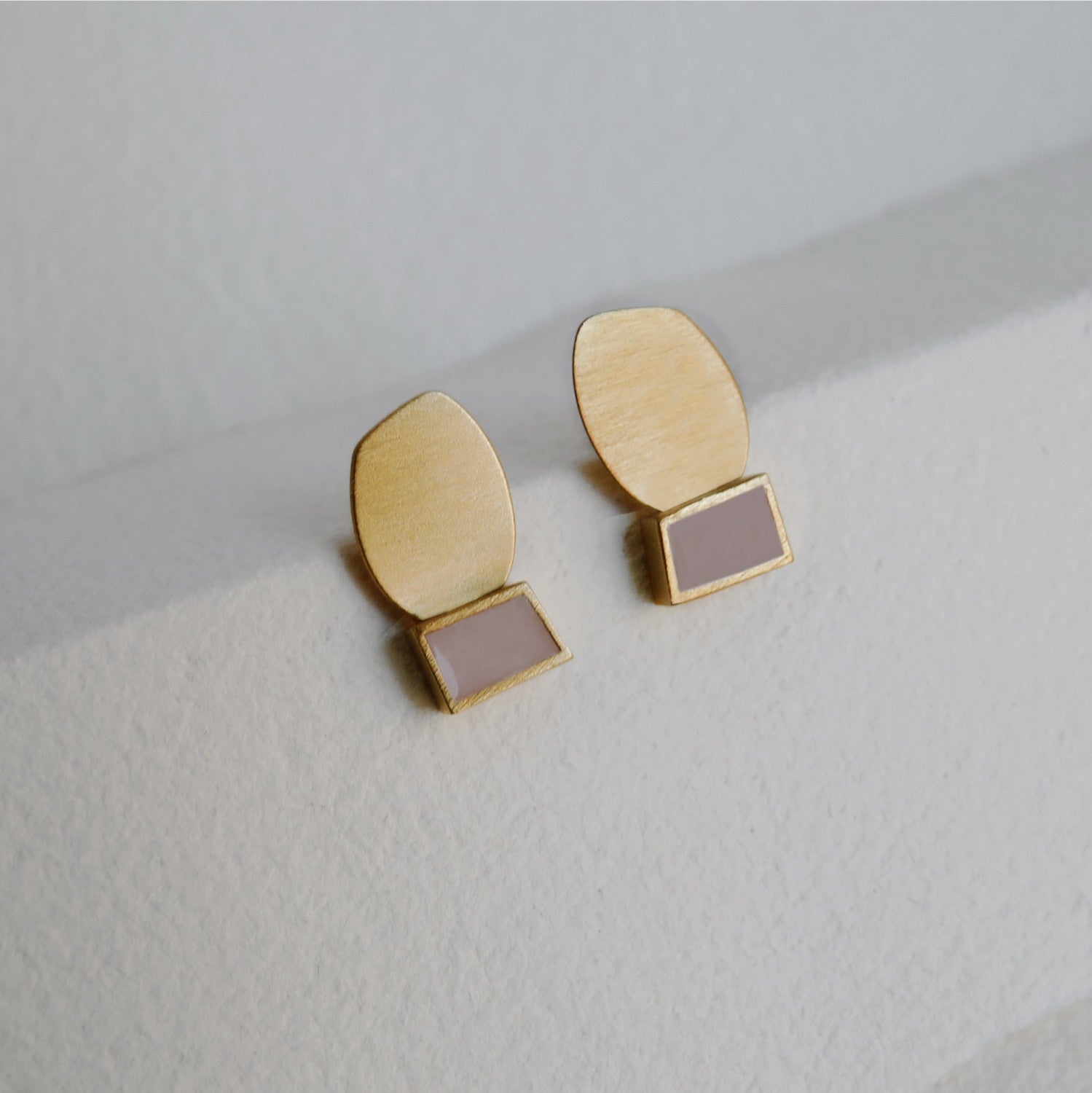 Small earrings with two connected, imperfect geometric shapes. Piece made of 24K gold-plated matte metal and mauve enamel. Butterfly nut closure.