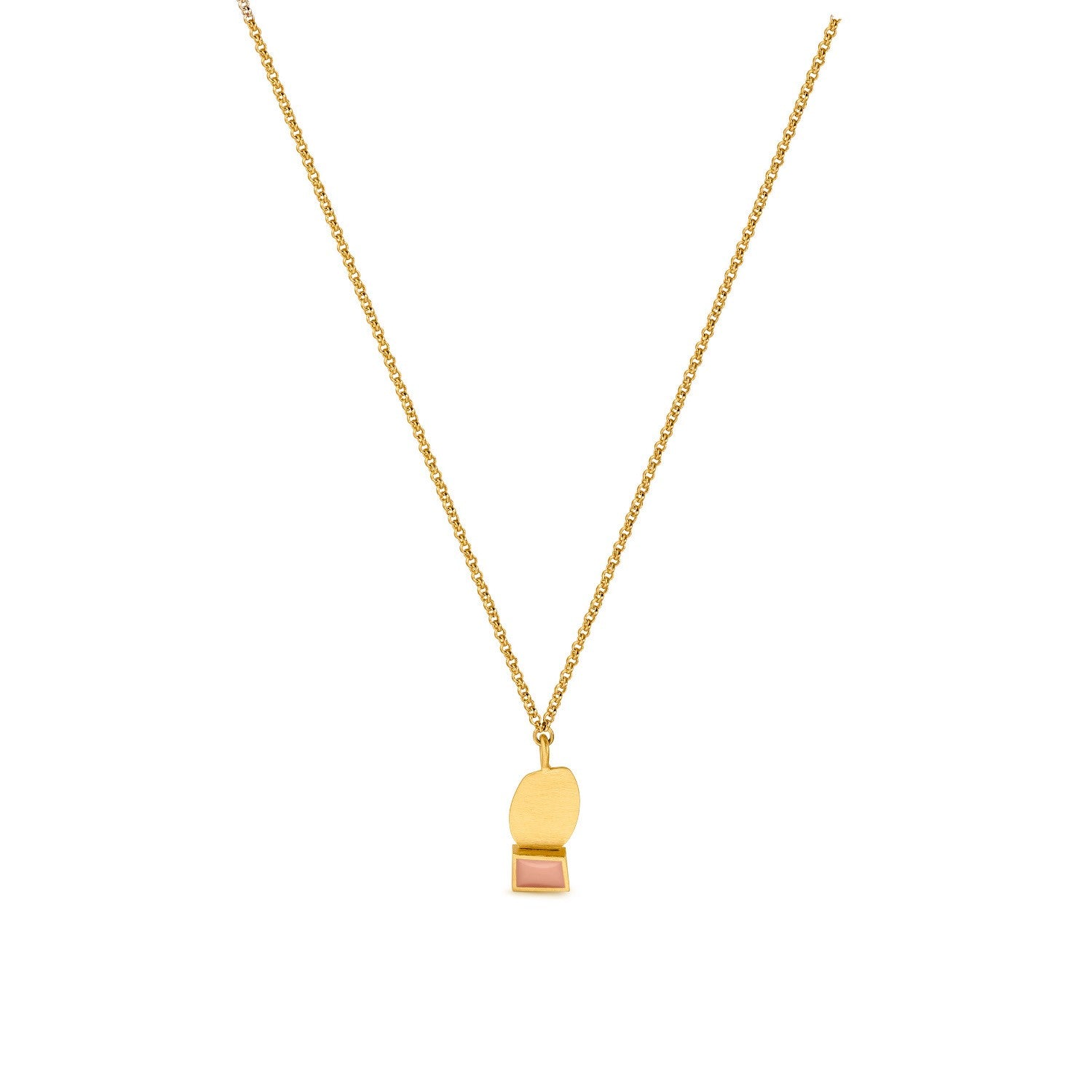 Necklace with a small pendant with two imperfect geometric shapes that combine randomly. Piece made of 24K gold-plated matte metal and mauve enamel. Chain with lobster closing and extension chain.