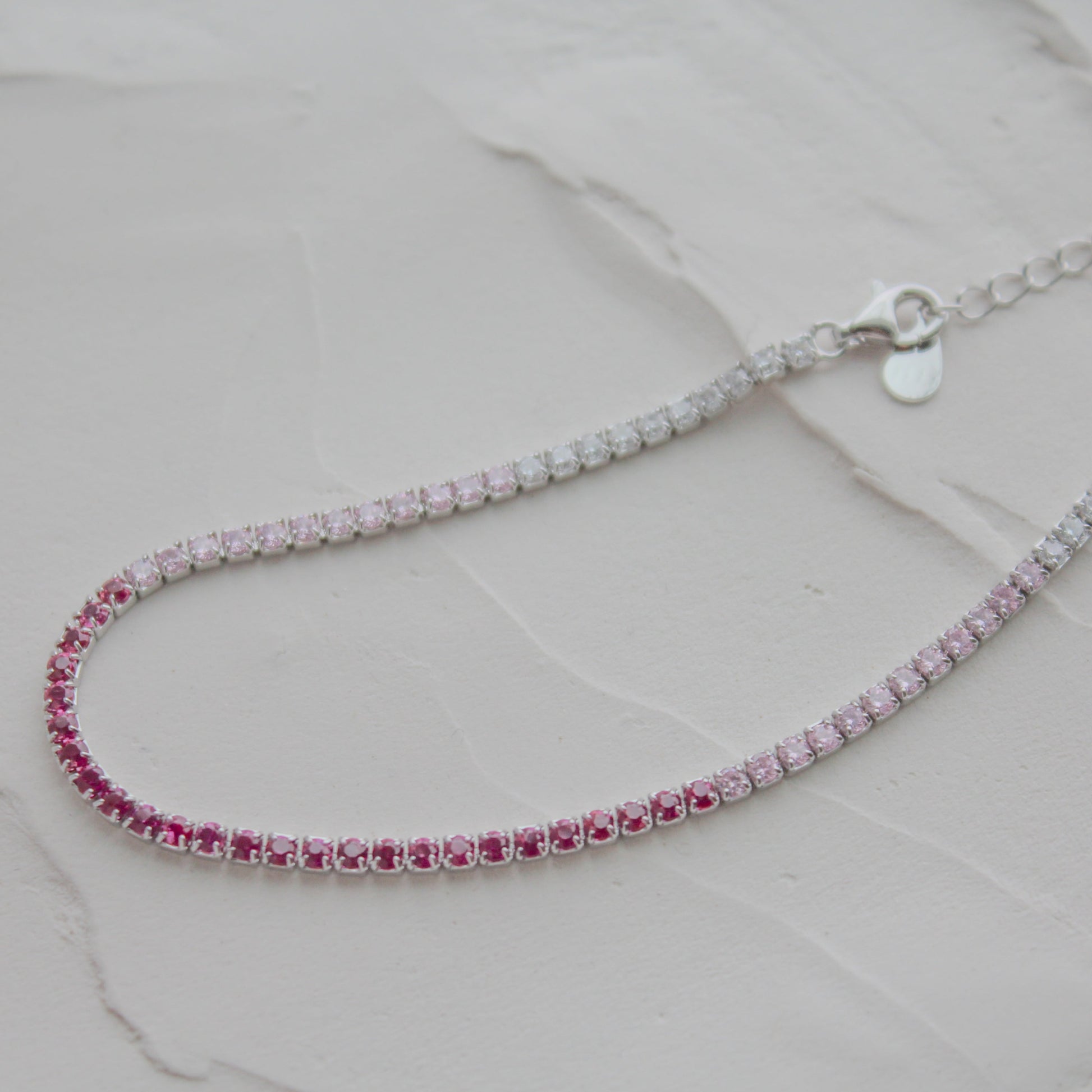 Take your daring style to the next level with our Pink Tennis Bracelet. Featuring a stunning riviere design handcrafted in Italy, this bold piece is adorned with sparkling pink cubic zirconia. Elevate any outfit and make a statement with this luxurious accessory!
