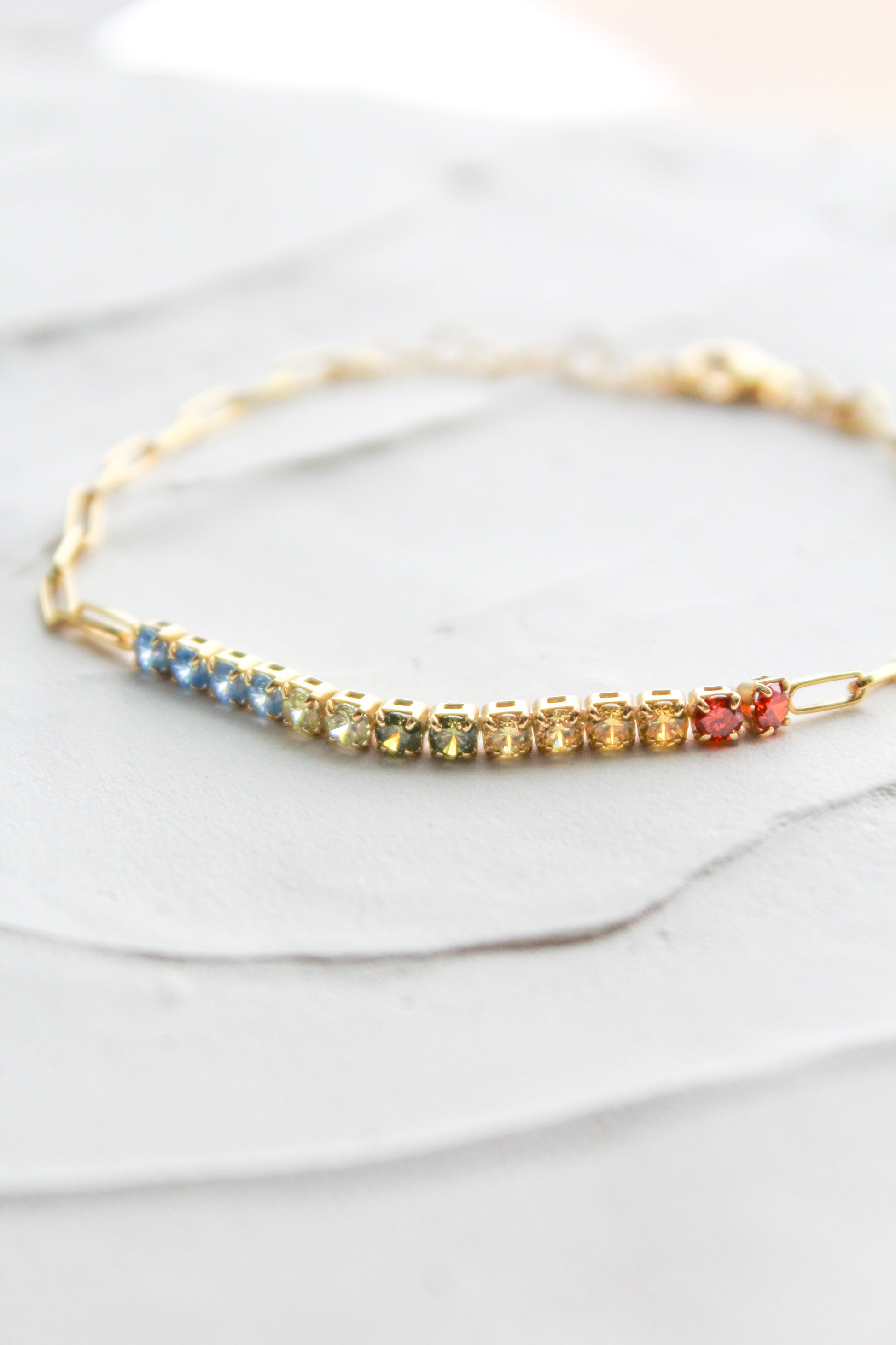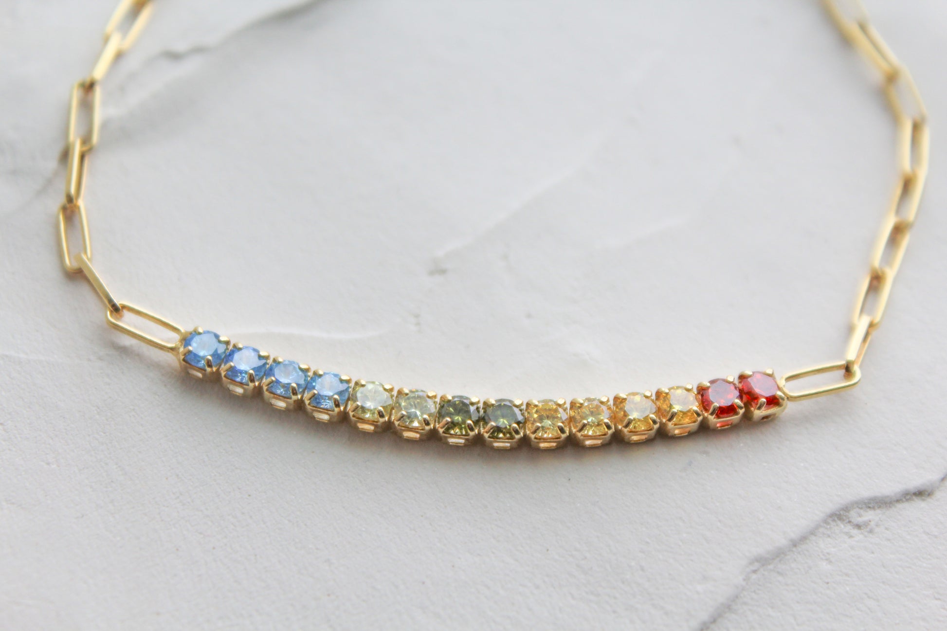Add a pop of color and personality to everyday with our Rainbow Paperclip Bracelet! Featuring a playful mix of rainbow cubic zirconia and a trendy paperclip chain, this bracelet will show off your fun and vibrant side. Perfect for anyone who doesn't take themselves too seriously.