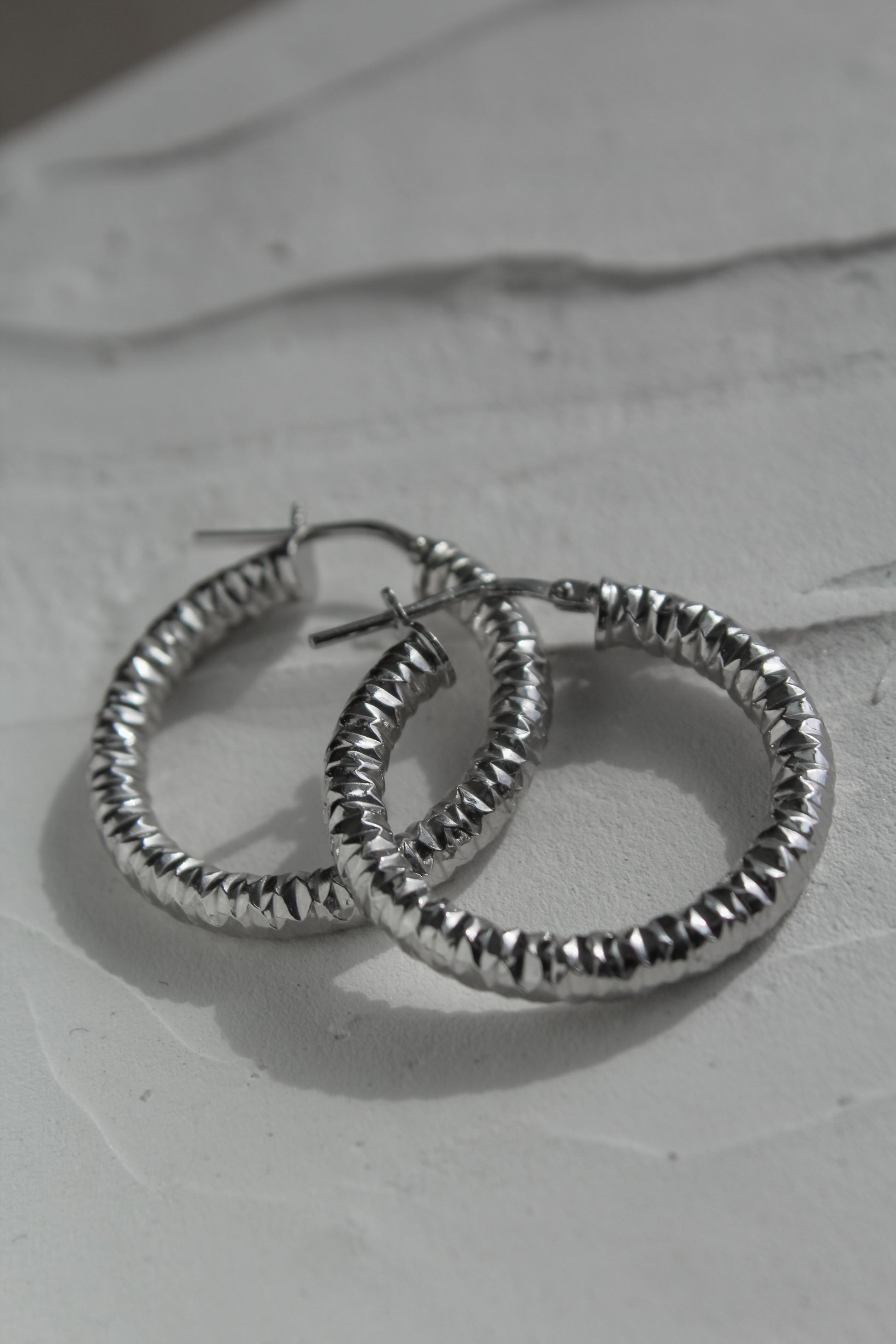 Upgrade your earring game with these Textured Silver Hoops. The foil-like texture adds a unique sparkle to these large sterling silver hoops. Shine on with this playful, quirky accessory!
